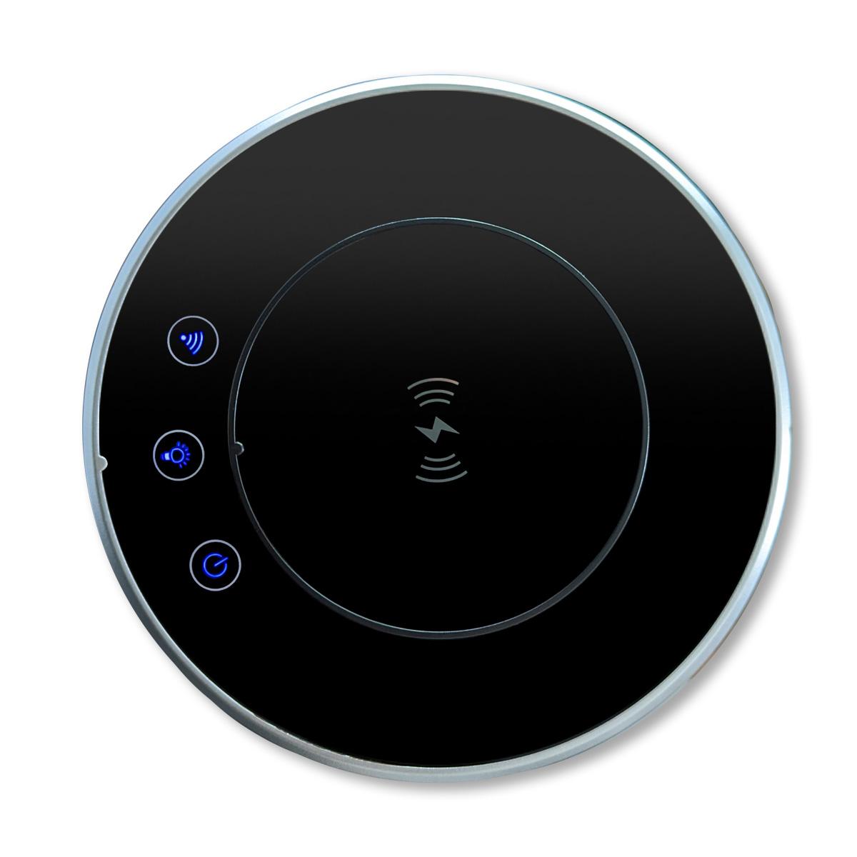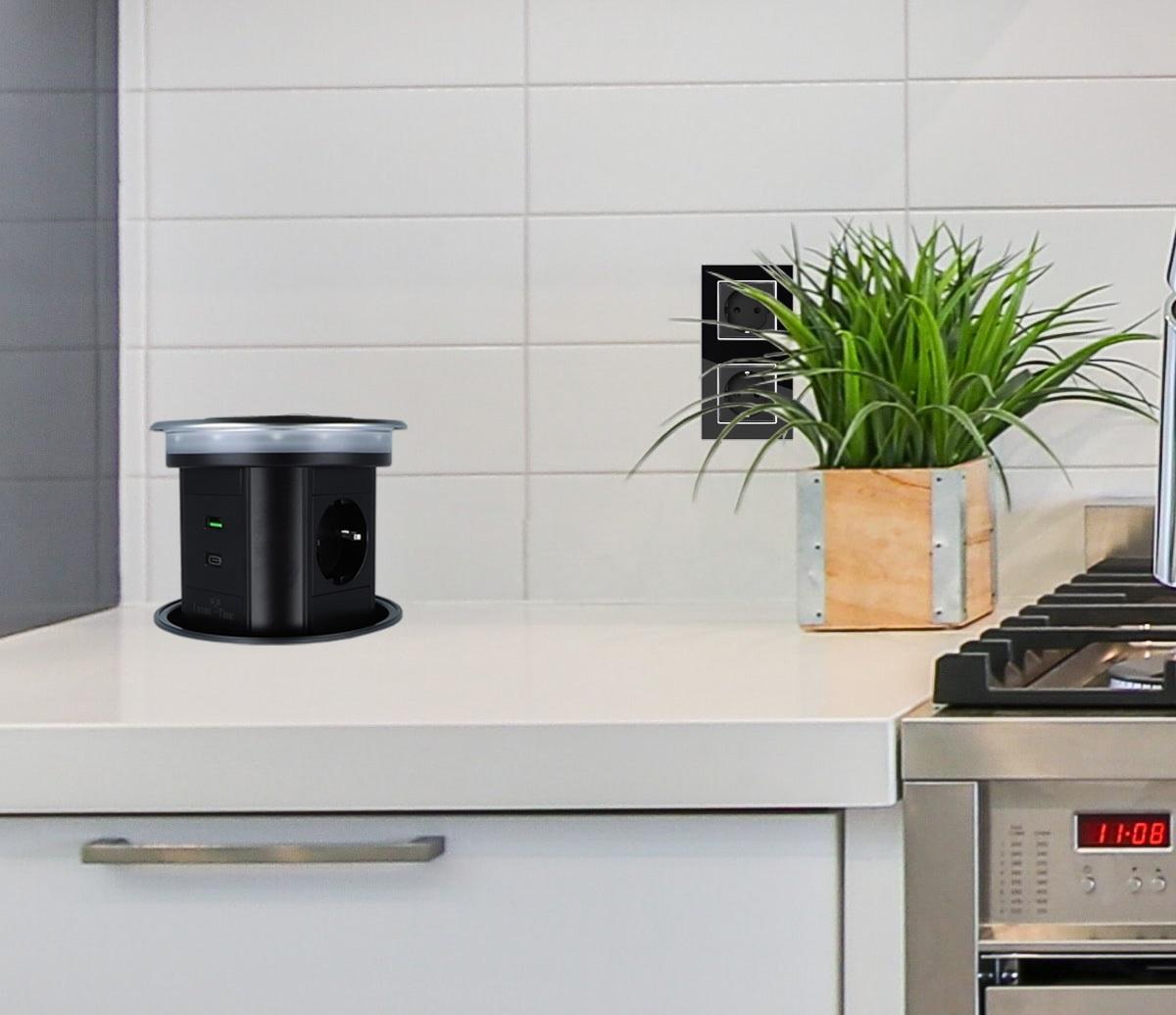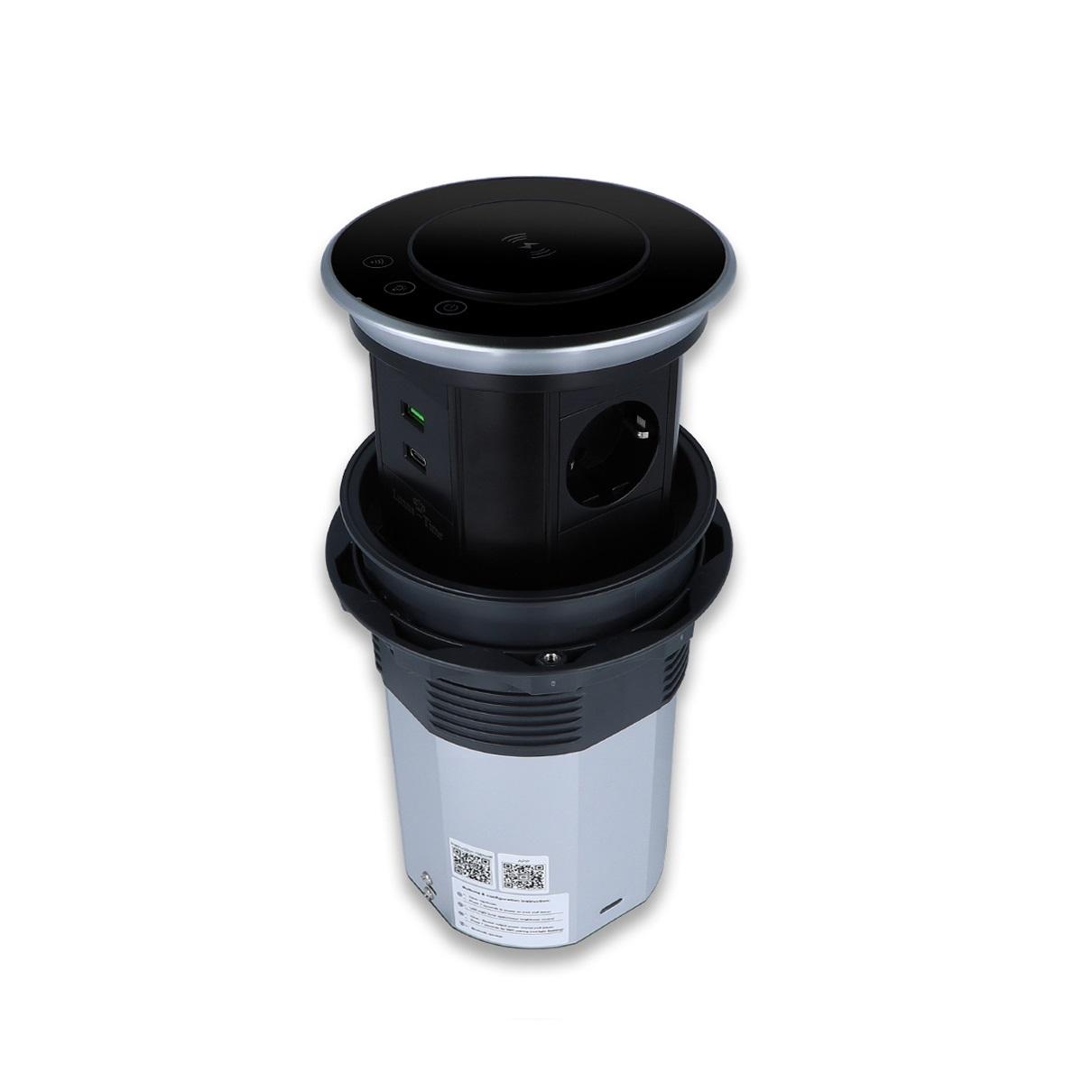 WLAN-Tischsteckdose in Glas-Optik mit 3 Steckdosen und USB-A&C-AnschlussDiese Tischsteckdose mit integrierter Induktions-Ladestation kann z. B. in Tischplatten verbaut werden, um die Küchenarbeitsfläche oder den Schreibtisch ordentlicher aussehen zu lassen. Über die WLAN-Funktion (SmartLife App) lässt die Tischsteckdose sich ein- oder ausfahren und die Steckdosen schalten. Zusätzlich verfügt die Tischsteckdose über ein dimmbares Nachtlicht, dass über die App oder an der Tischsteckdose selbst bedient werden kann. Mit den drei eingebauten Steckdosen, sowie je einem USB-A und USB-C Anschluss bietet die Tischsteckdose genügend Anschlussmöglichkeiten. Durch die Induktions-Ladefläche auf der Oberseite ist sowohl im ein- als auch ausgefahrenem Zustand das Laden eines Smartphones o. ä. problemlos möglich. Er bietet auch im Alltag ein hohes Maß an Flexibilität, da bei Nichtgebrauch der Deckel komplett versenkt werden kann und somit sehr unauffällig ist. Die Tischsteckdose wird mit dem angeschlossenen Kabel + Schuko-Stecker einfach in der nächsten Steckdose eingesteckt. Es ist keine Elektroinstallation von Nöten. Technische Daten:
