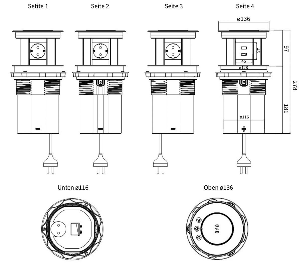 Wichtiger Hinweis: Diese Tischsteckdose ist im geschlossenen Zustand nach IP55 gegen Staub und Strahlwasser geschützt. Im geöffneten Zustand besteht kein Schutz gegen Feuchtigkeit oder Spritzwasser. Die Nutzung in feuchten oder nassen Umgebungen ist nur im geschlossenen Zustand zulässig. Bitte vor der Anwendung sicherstellen, dass keine Feuchtigkeit ins Gehäuse eindringen kann. Abmessungen: Tischplattenöffnung Ø: 125 mm Tischplattenstärke: 8 – 60 mm Ausfahrbare Höhe: 141 mm Gesamthöhe: 226 mm Lieferumfang: Im Lieferumfang enthalten ist: