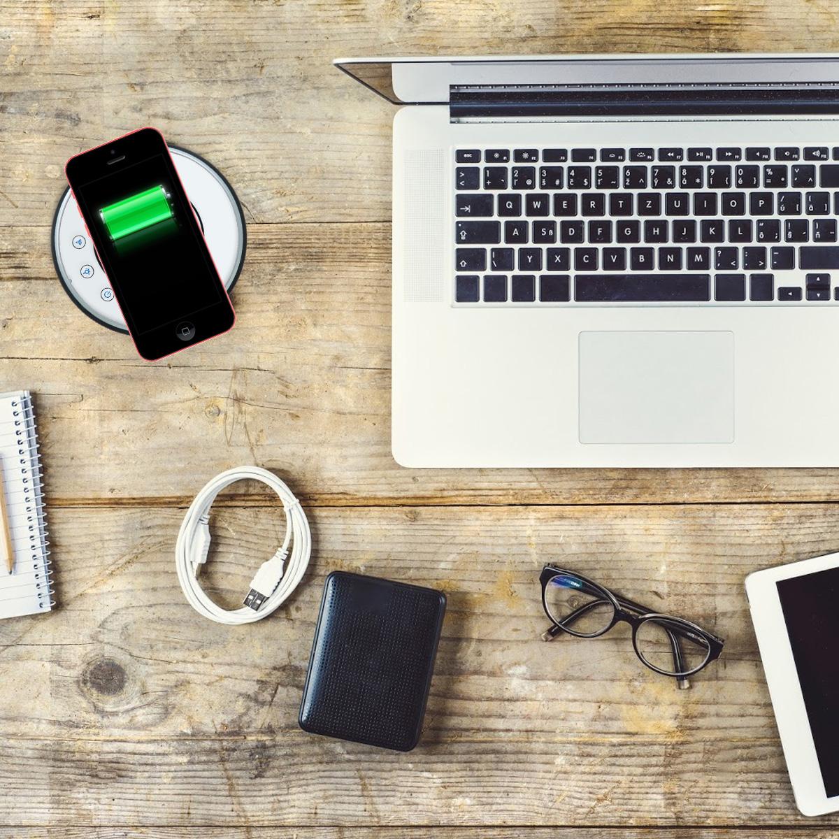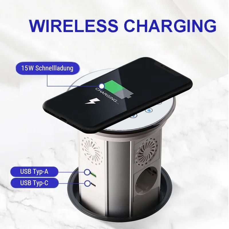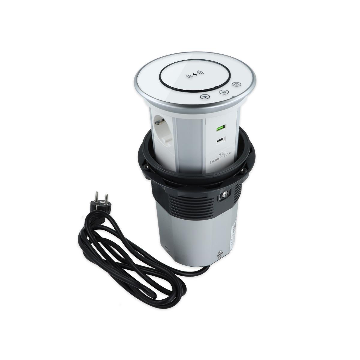 WLAN-Tischsteckdose in Glas-Optik mit 3 Steckdosen und USB-A&C-AnschlussDiese Tischsteckdose mit integrierter Induktions-Ladestation kann z. B. in Tischplatten verbaut werden, um die Küchenarbeitsfläche oder den Schreibtisch ordentlicher aussehen zu lassen. Über die WLAN-Funktion (SmartLife App) lässt die Tischsteckdose sich ein- oder ausfahren und die Steckdosen schalten. Zusätzlich verfügt die Tischsteckdose über ein dimmbares Nachtlicht, dass über die App oder an der Tischsteckdose selbst bedient werden kann. Mit den drei eingebauten Steckdosen, sowie je einem USB-A und USB-C Anschluss bietet die Tischsteckdose genügend Anschlussmöglichkeiten. Durch die Induktions-Ladefläche auf der Oberseite ist sowohl im ein- als auch ausgefahrenem Zustand das Laden eines Smartphones o. ä. problemlos möglich. Er bietet auch im Alltag ein hohes Maß an Flexibilität, da bei Nichtgebrauch der Deckel komplett versenkt werden kann und somit sehr unauffällig ist. Die Tischsteckdose wird mit dem angeschlossenen Kabel + Schuko-Stecker einfach in der nächsten Steckdose eingesteckt. Es ist keine Elektroinstallation von Nöten. Technische Daten: