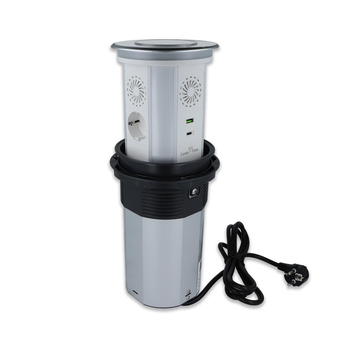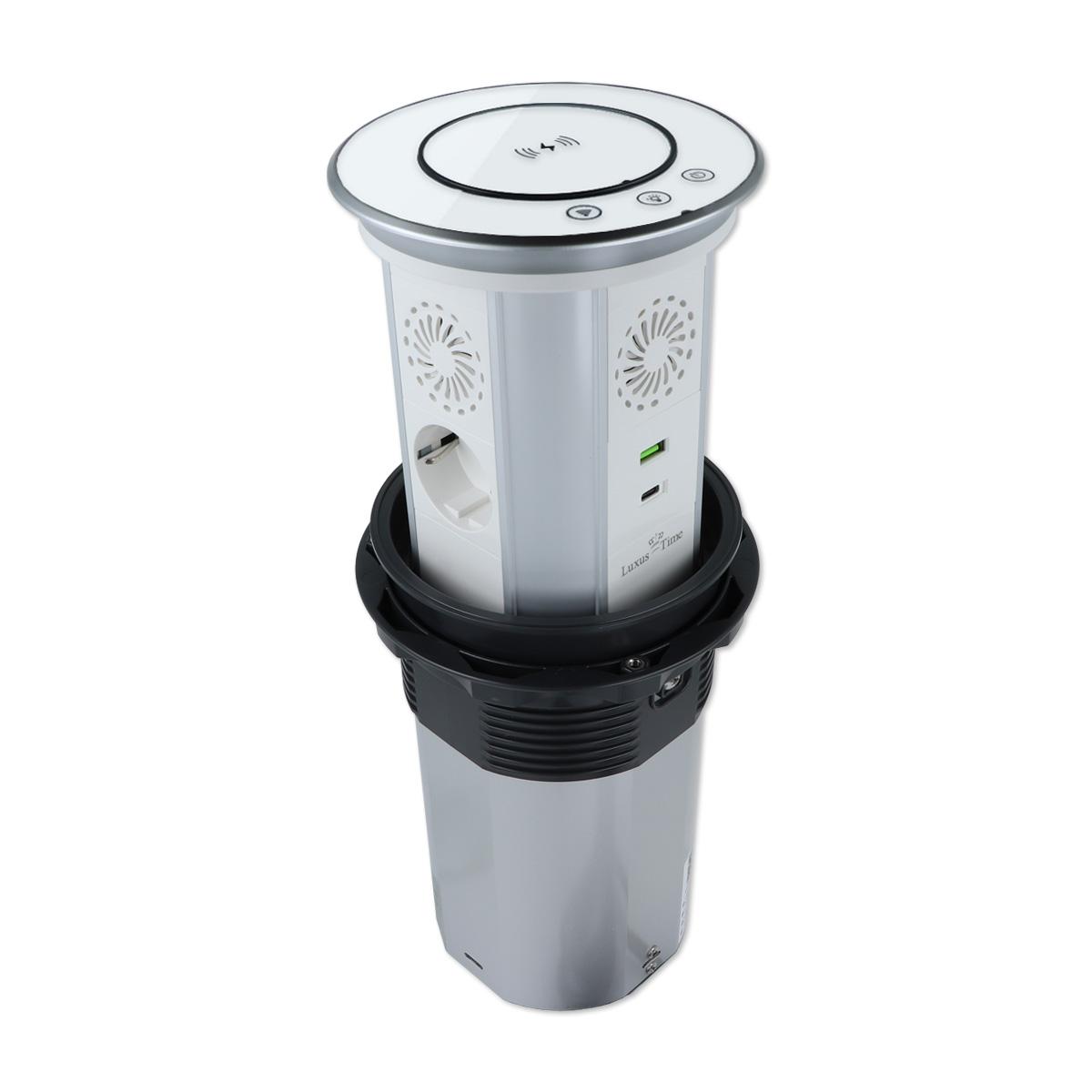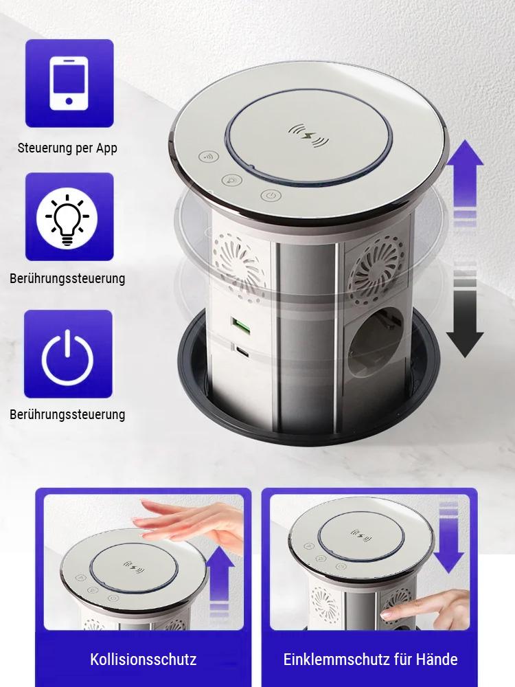 WLAN-Tischsteckdose in Glas-Optik mit Bluetooth-Lautsprechern, 3 Steckdosen und USB-A&C-AnschlussDiese Tischsteckdose mit integrierter Induktions-Ladestation kann z. B. in Tischplatten verbaut werden, um die Küchenarbeitsfläche oder den Schreibtisch ordentlicher aussehen zu lassen. Über die WLAN-Funktion (SmartLife App) lässt die Tischsteckdose sich ein- oder ausfahren, die Steckdosen schalten und die Musik steuern. Zusätzlich verfügt die Tischsteckdose über ein dimmbares Nachtlicht, dass über die App oder an der Tischsteckdose selbst bedient werden kann. Mit den drei eingebauten Steckdosen, sowie je einem USB-A und USB-C Anschluss bietet die Tischsteckdose genügend Anschlussmöglichkeiten. Durch die Induktions-Ladefläche auf der Oberseite ist sowohl im ein- als auch ausgefahrenem Zustand das Laden eines Smartphones o. ä. problemlos möglich. Die vier umlaufenden Bluetooth-Lautsprecher bieten die Möglichkeit beim Kochen einen Podcast oder am Schreibtisch konzentrations-fördernde Musik zu hören. Er bietet auch im Alltag ein hohes Maß an Flexibilität, da bei Nichtgebrauch der Deckel komplett versenkt werden kann und somit sehr unauffällig ist. Die Tischsteckdose wird mit dem angeschlossenen Kabel + Schuko-Stecker einfach in der nächsten Steckdose eingesteckt. Es ist keine Elektroinstallation von Nöten. Technische Daten: