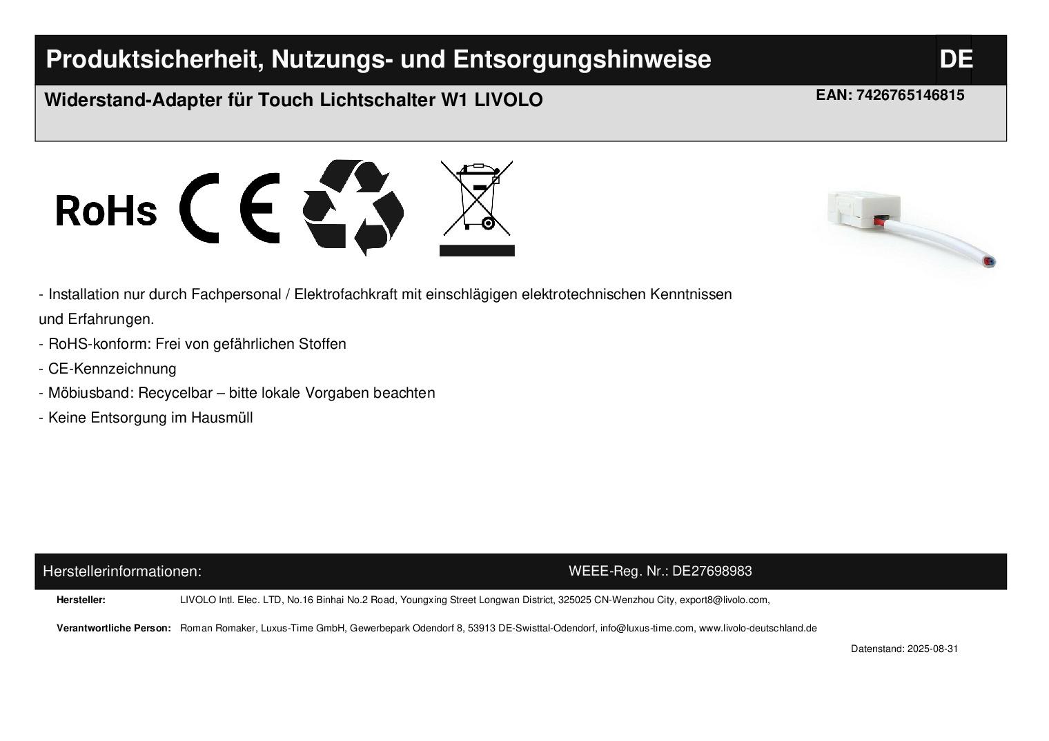 Livolo LED-Widerstands-Adapter W1Dies ist ein Livolo Widerstands-Adapter für Leuchten unter 20 Watt. Wenn mehrere Leuchten an einem Schalter angeschlossen werden, dann zählt die Gesamt-Wattzahl der Leuchten. Bitte beachten Sie, dass Sie für folgende Livolo Schalter keinen Widerstand-Adapter verwenden dürfen: Fragen? Rufen Sie uns an oder senden Sie uns eine E-Mail.